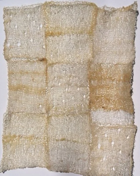 This is a wall hanging made with panels of hand knit raw silk covered with beeswax. Loosely based on traditional quilt blocks, the form reveals the nuanced textured of the fiber and its subtle tonal shifts. The heat of the melted wax brings out the color of the silk, a reaction to the seracin, the glue that holds the cocoon together. Wax and silk are both excretions from insects and the quilt has the look of a sloughed skin pinned to a wall, bringing with it ideas of blanketing and covering.